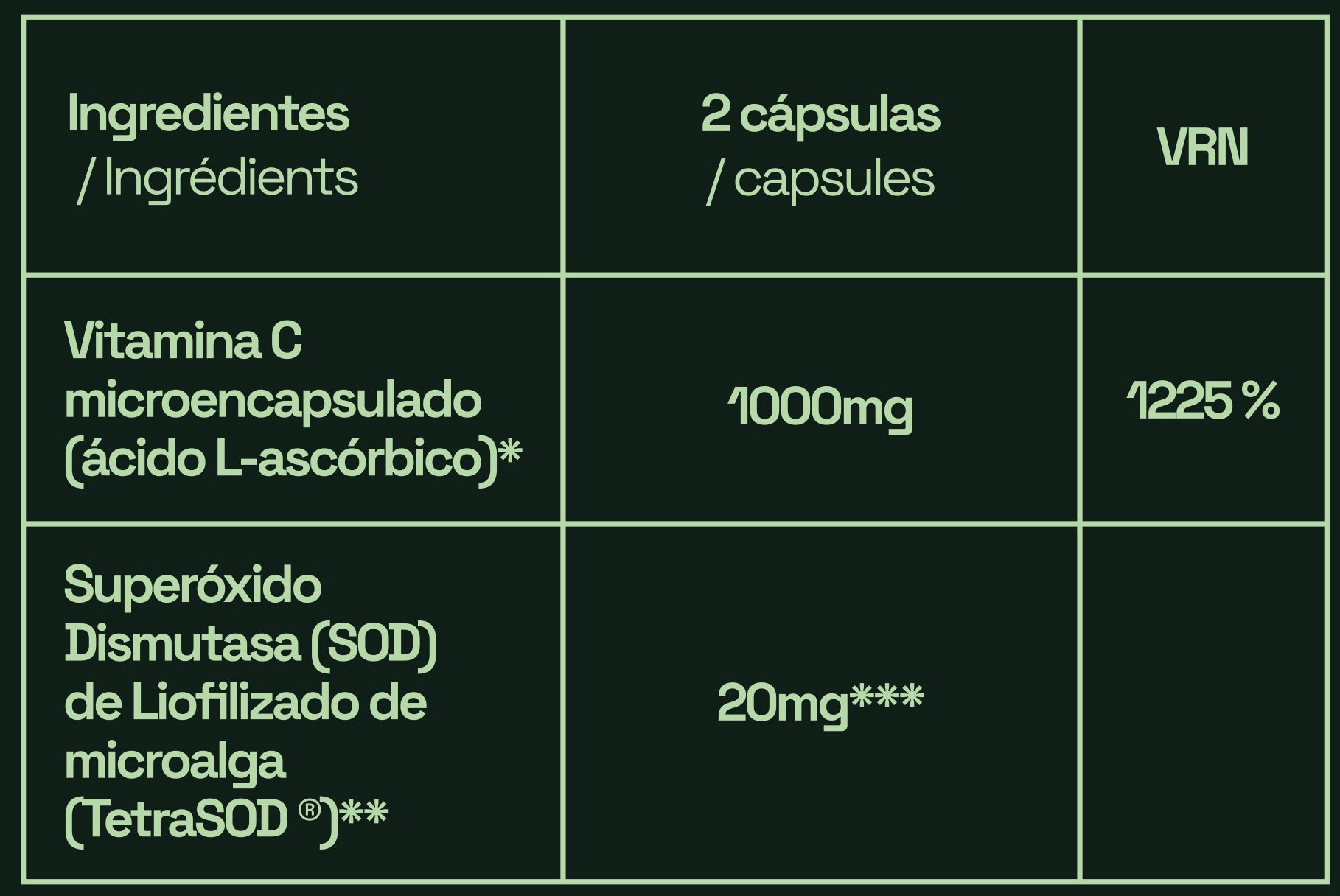 - TetraSOD® (Superóxido dismutasa de microalgas) → enzima antioxidante única que neutraliza el superóxido, uno de los radicales libres más dañinos, protegiendo a nivel celular y potenciando la acción de la vitamina C y lo mas importante, la protege de la oxidación.